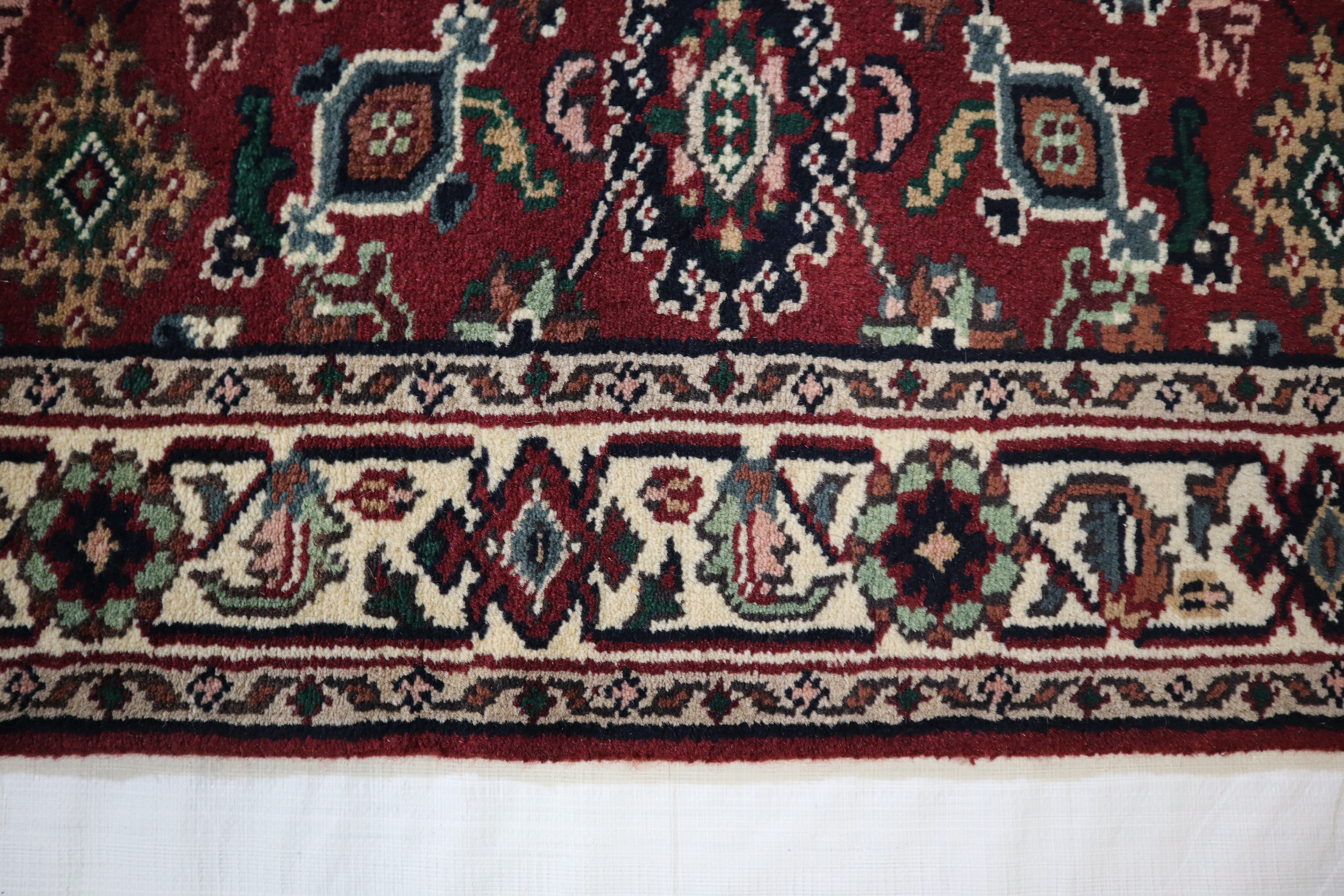 This beautiful hand-knotted rug is made with wool.