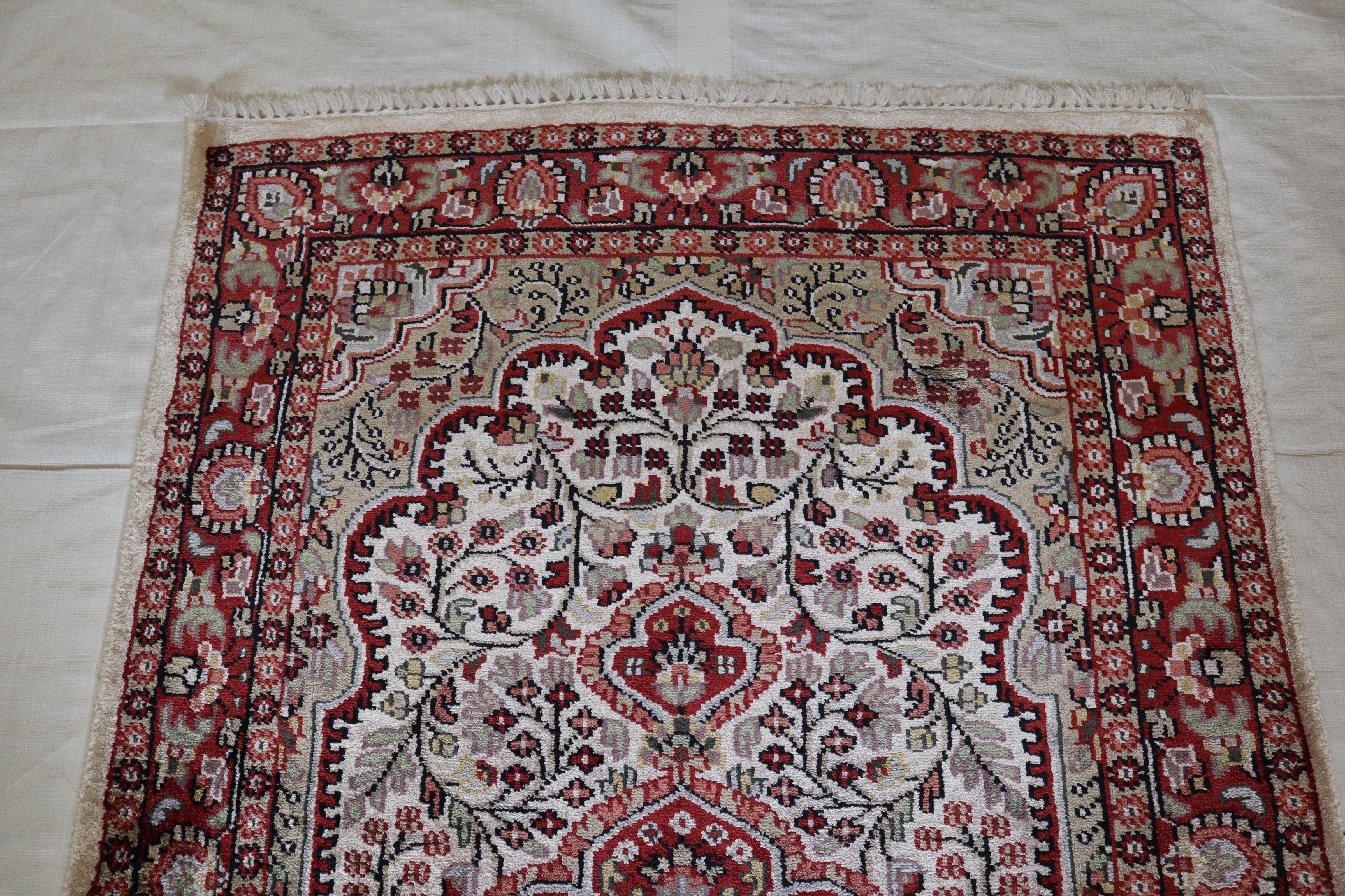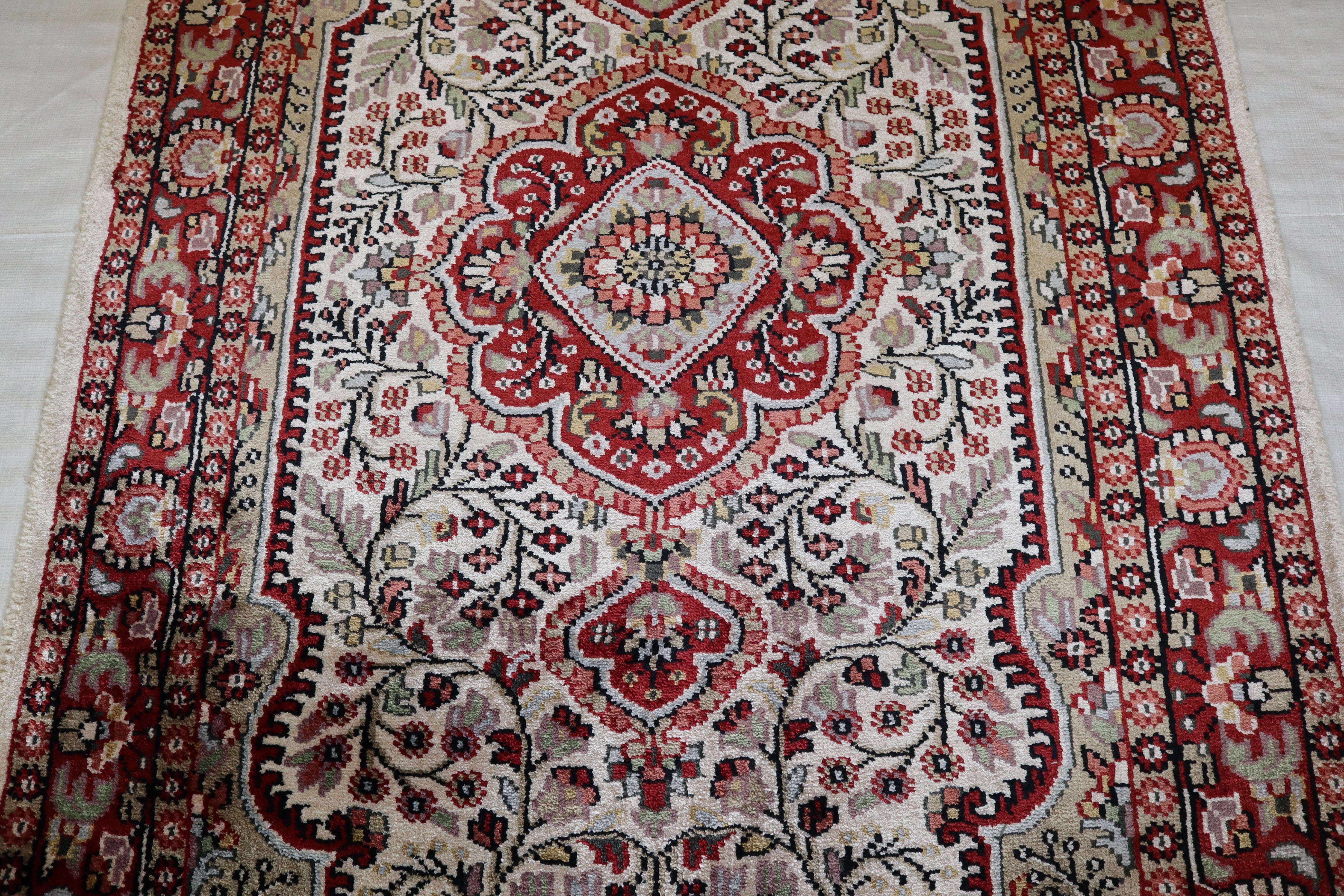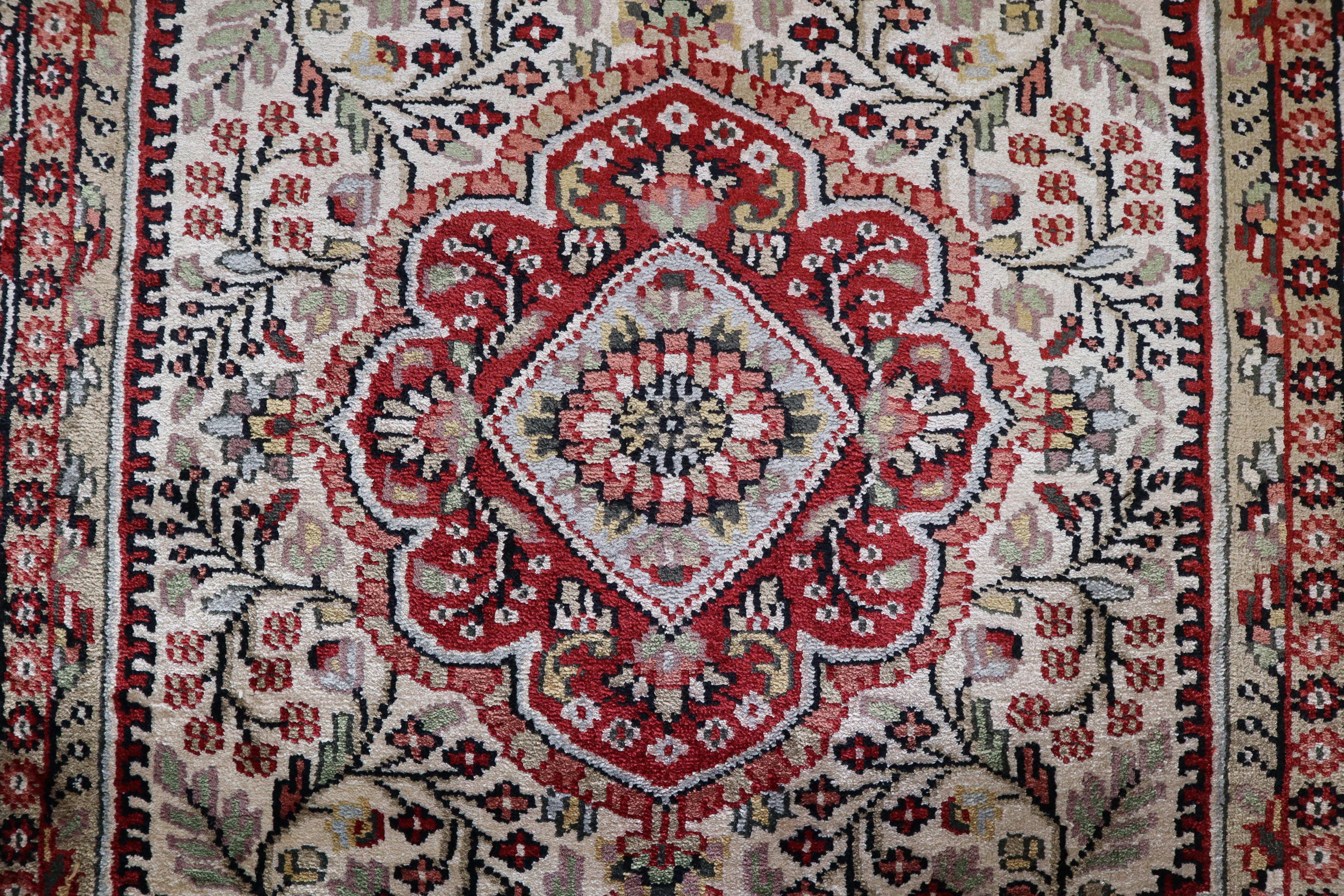 This beautiful hand-knotted rug is made with 100% wool and silk.