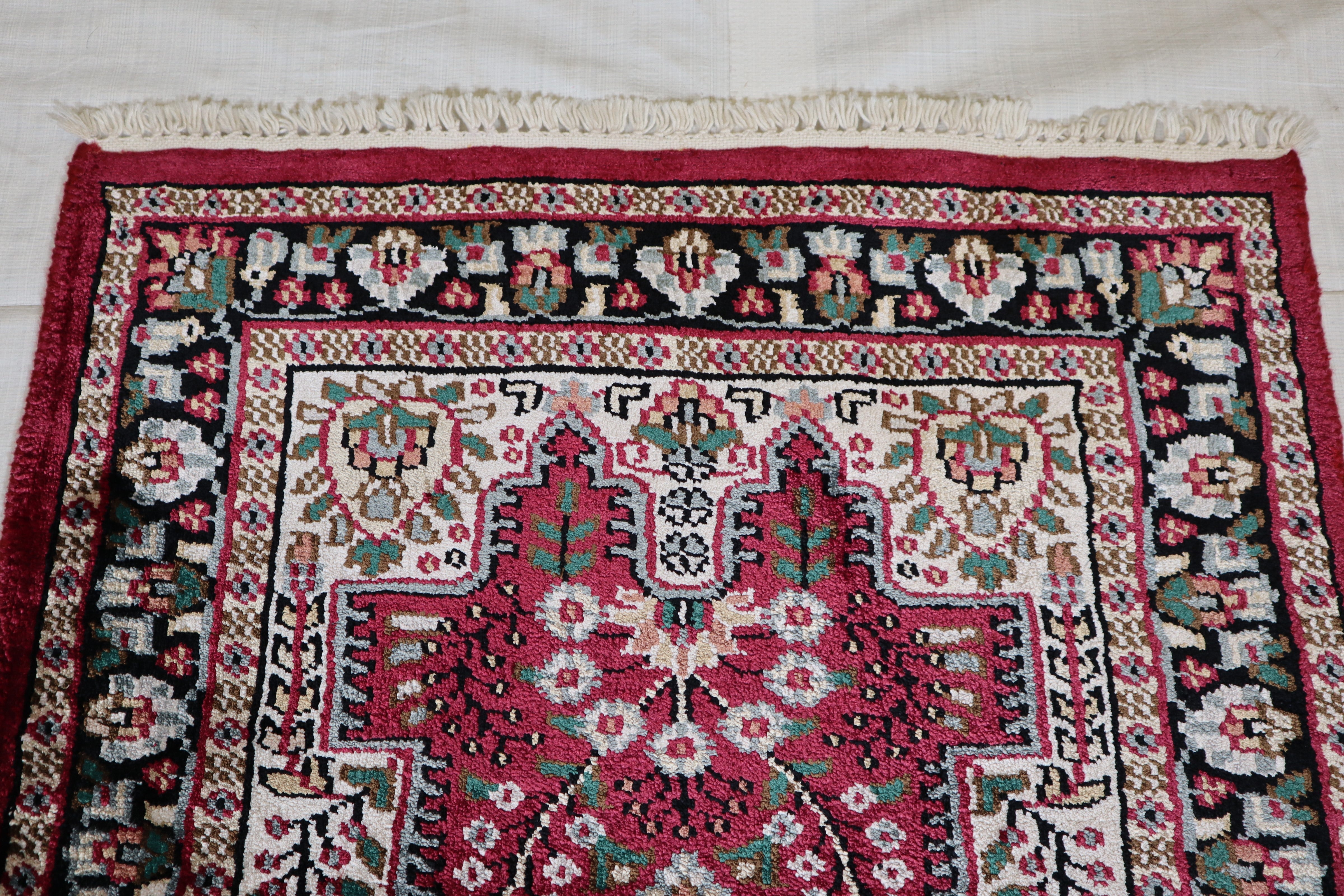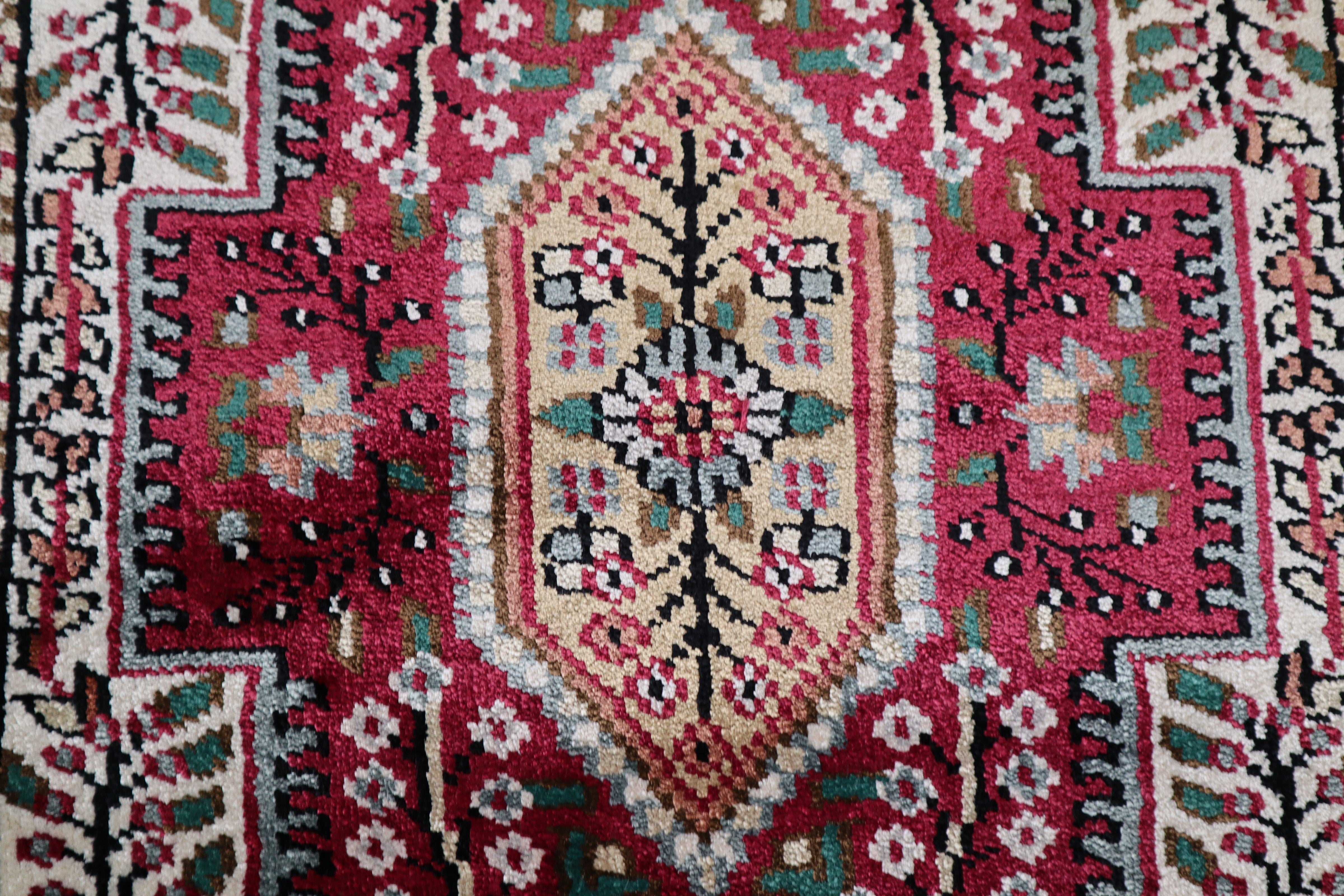 This beautiful hand-knotted rug is made with wool and silk.