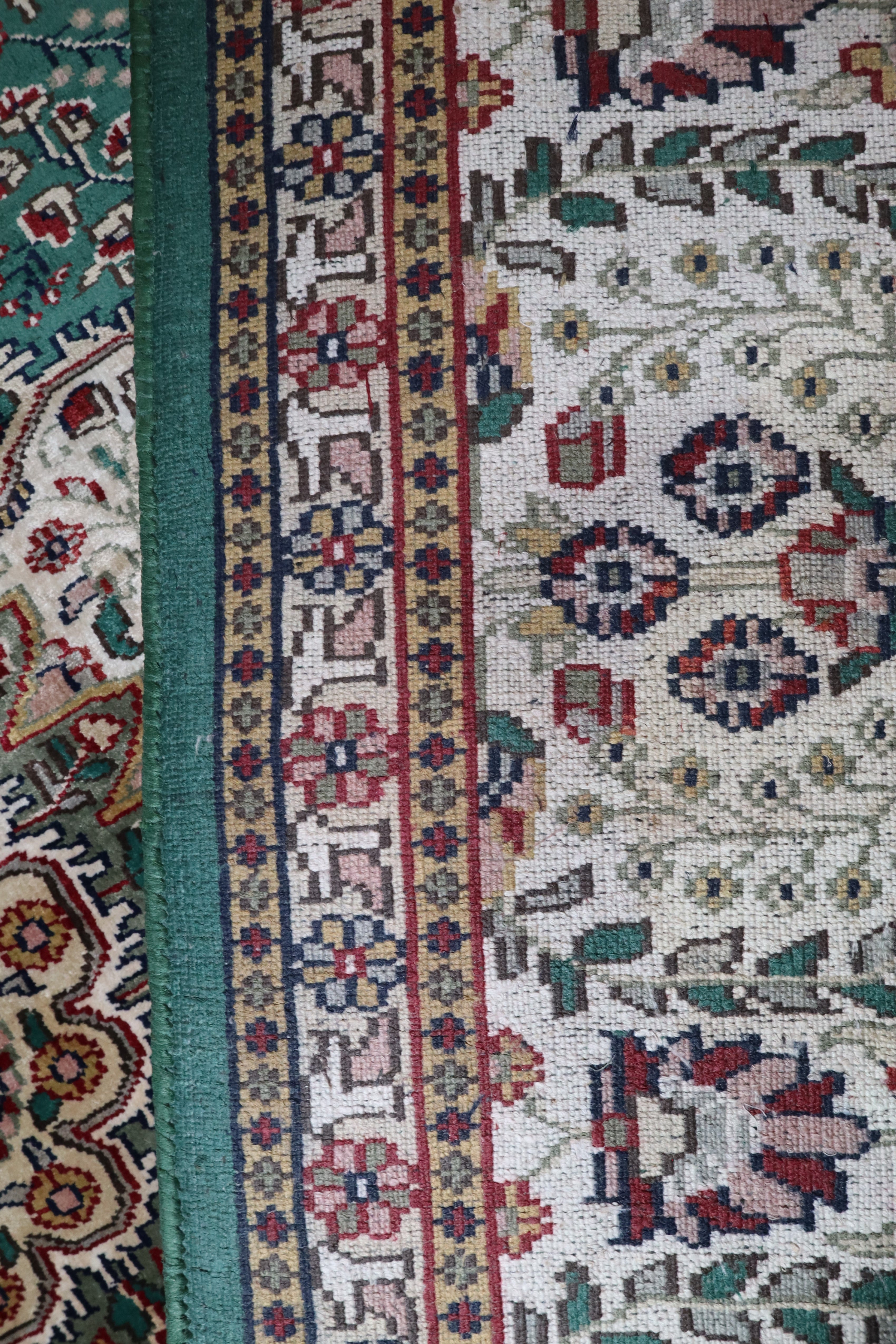 This beautiful hand-knotted rug is made with 100% lambs wool and silk.