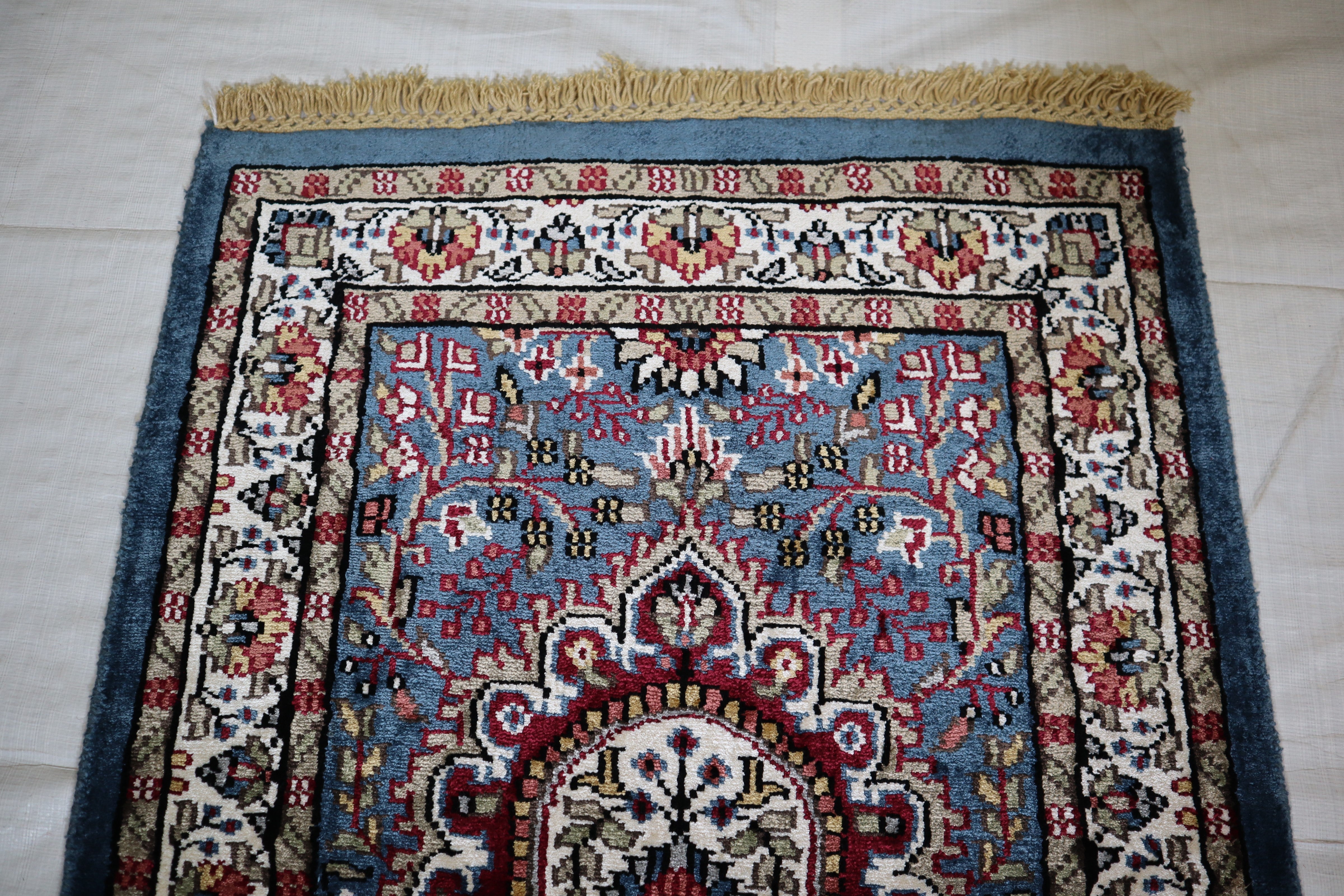 This beautiful hand-knotted rug is made with wool and silk.