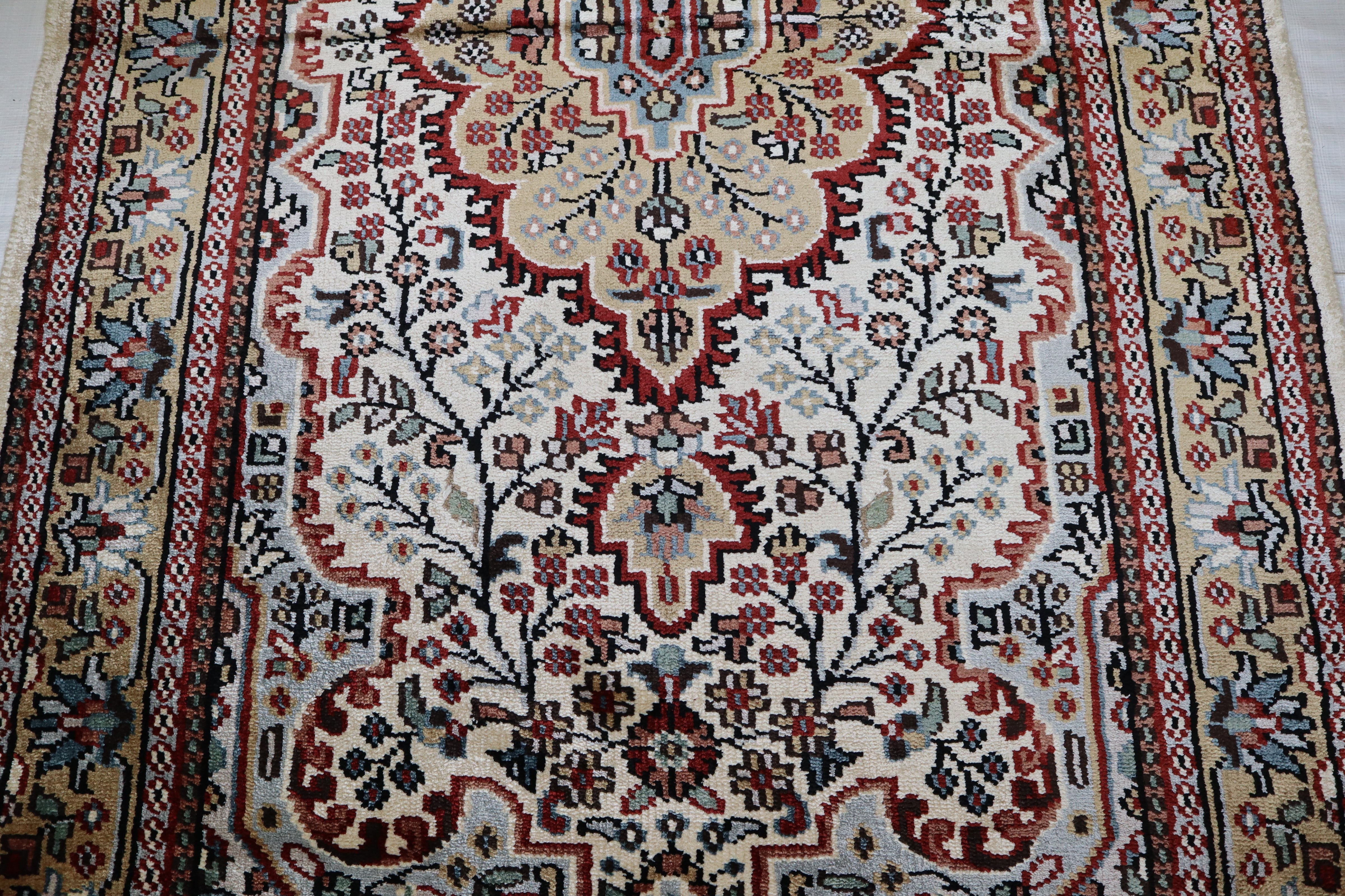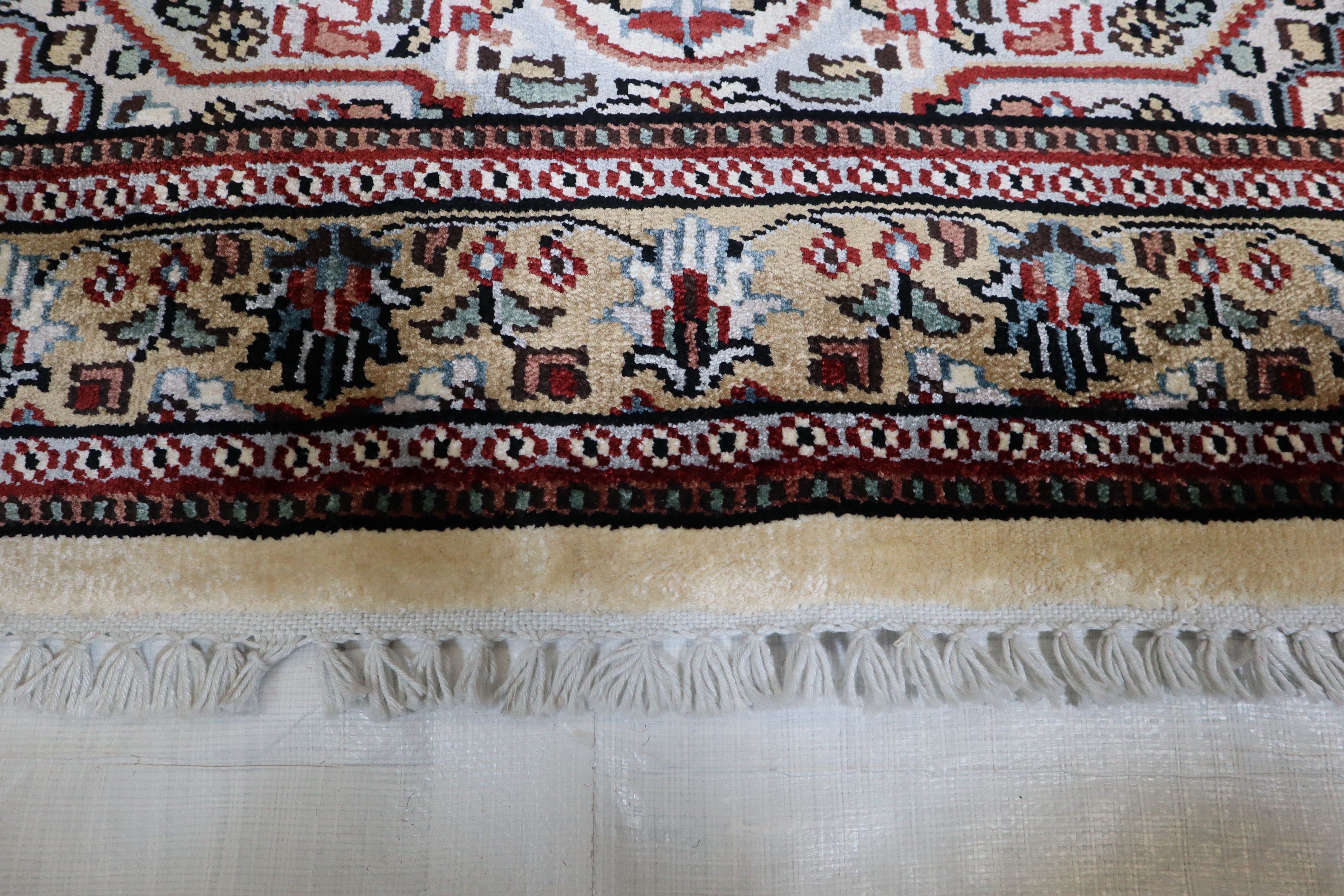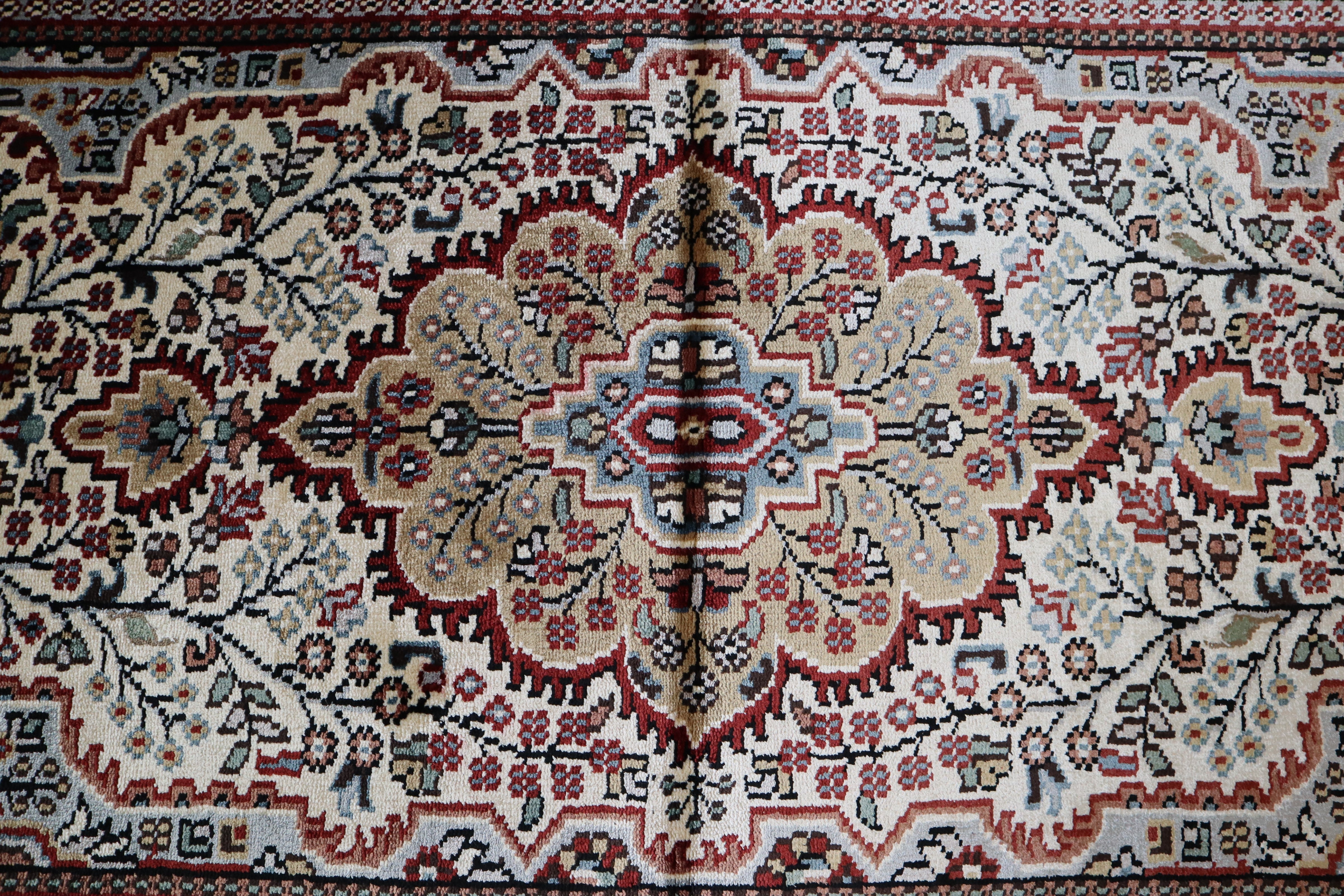This beautiful hand-knotted rug is made with 100% wool and silk.