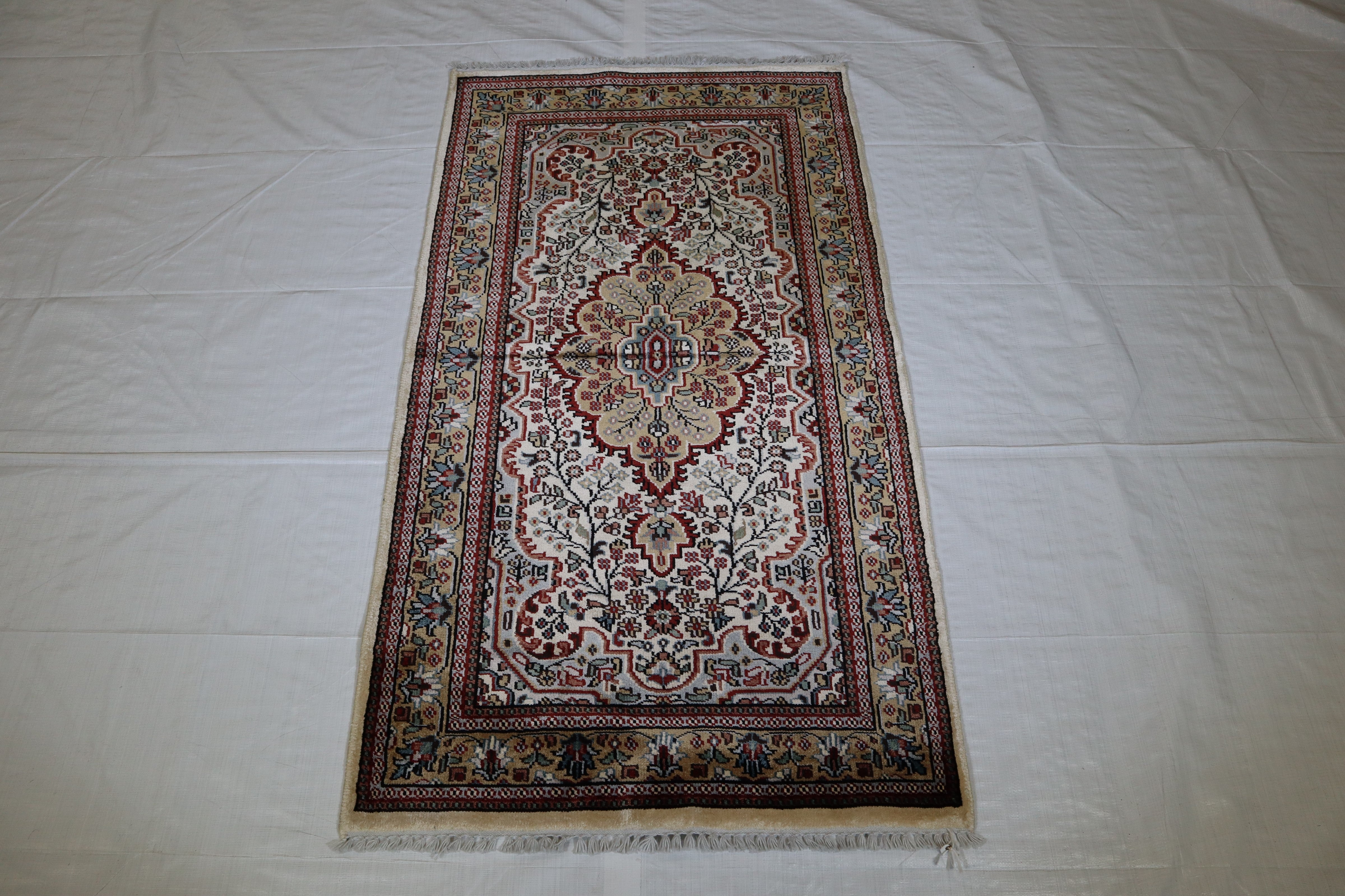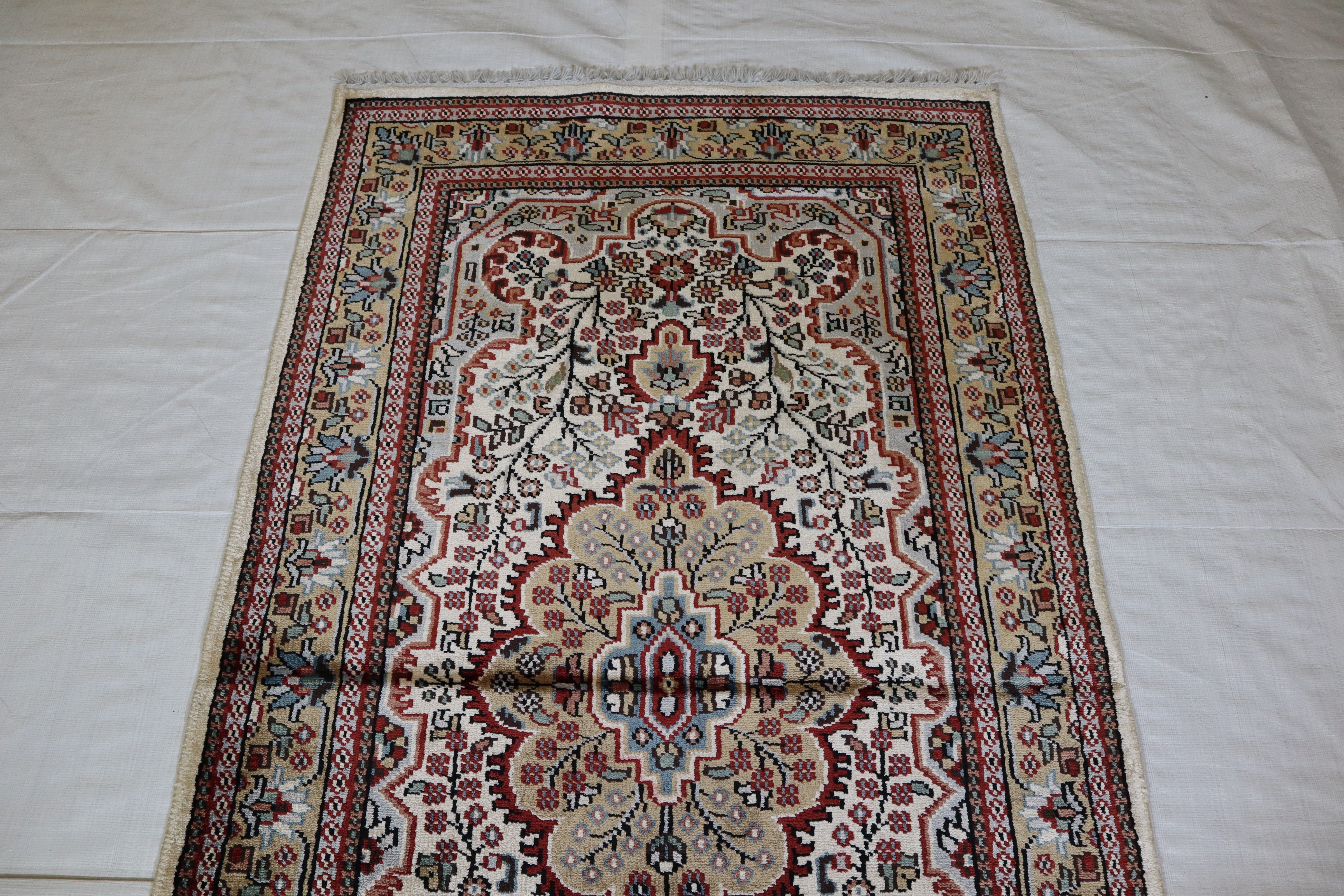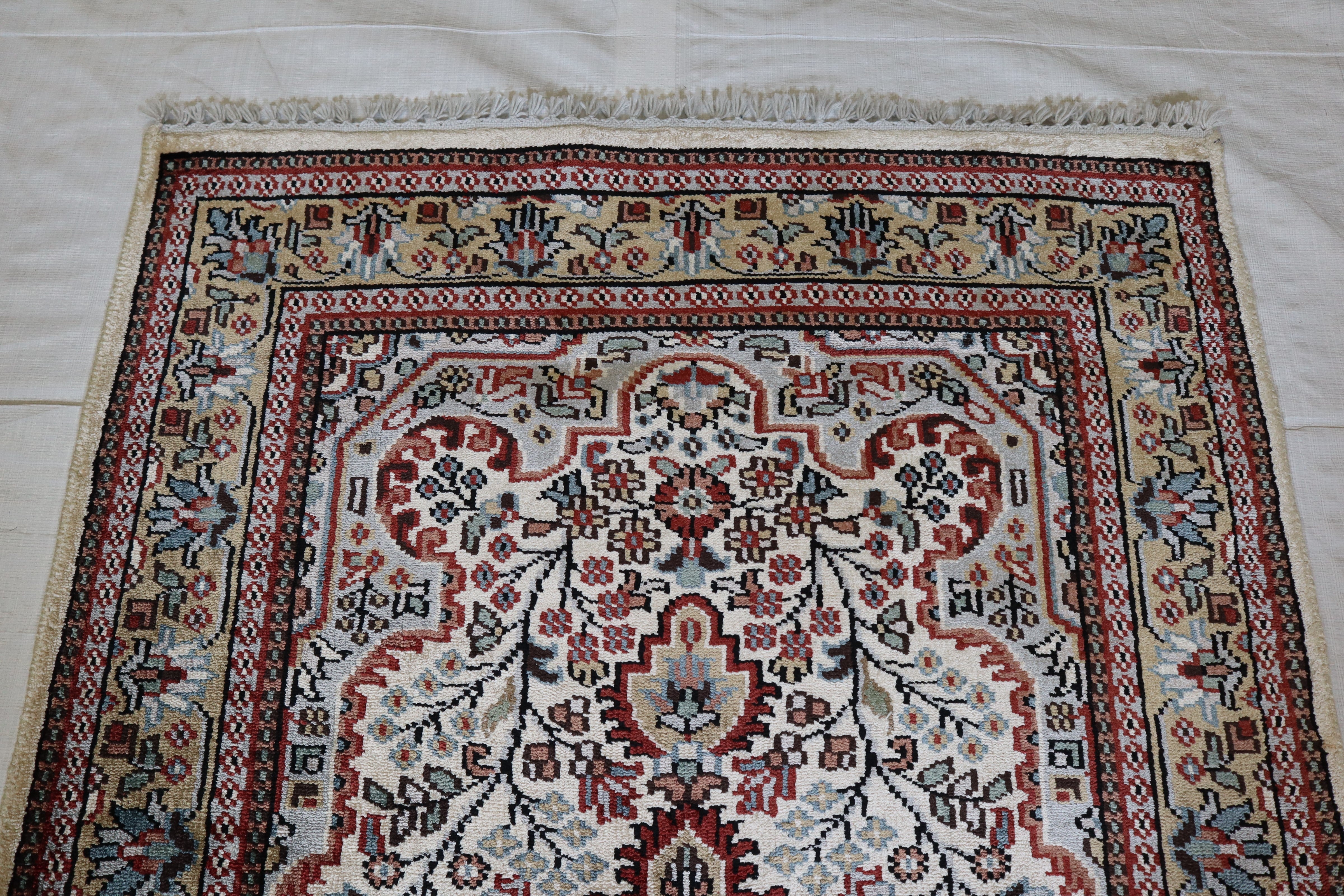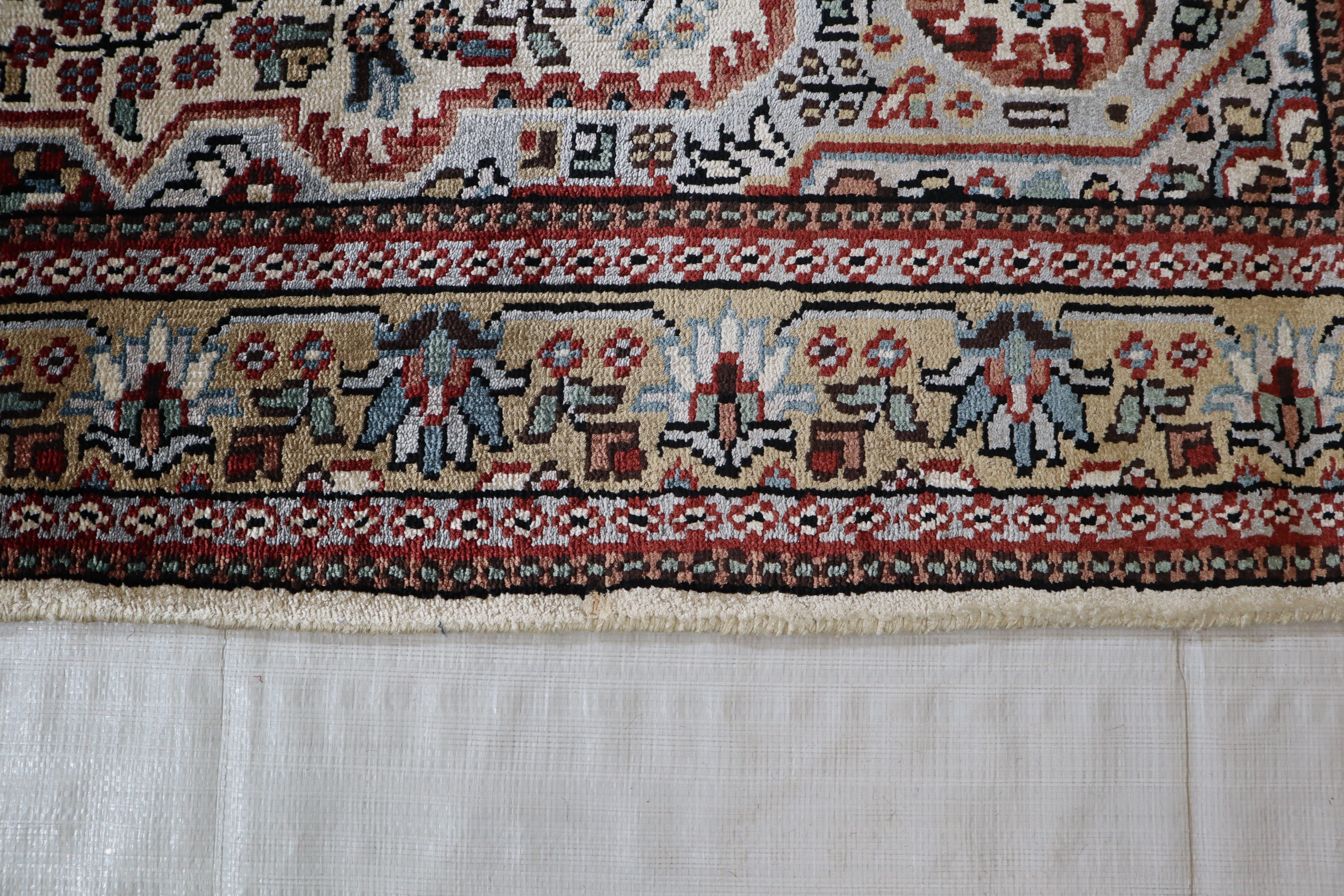 This beautiful hand-knotted rug is made with 100% wool and silk.