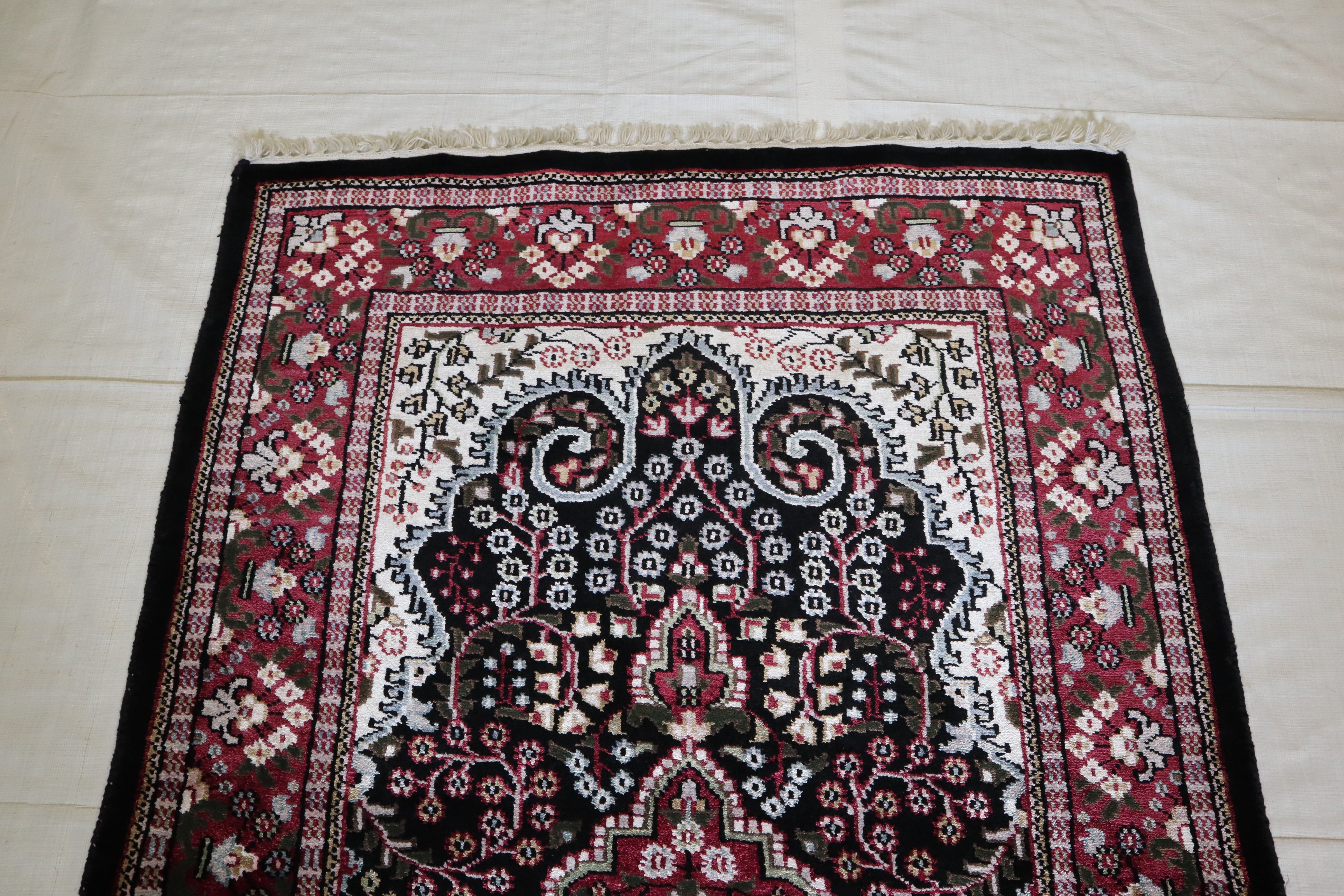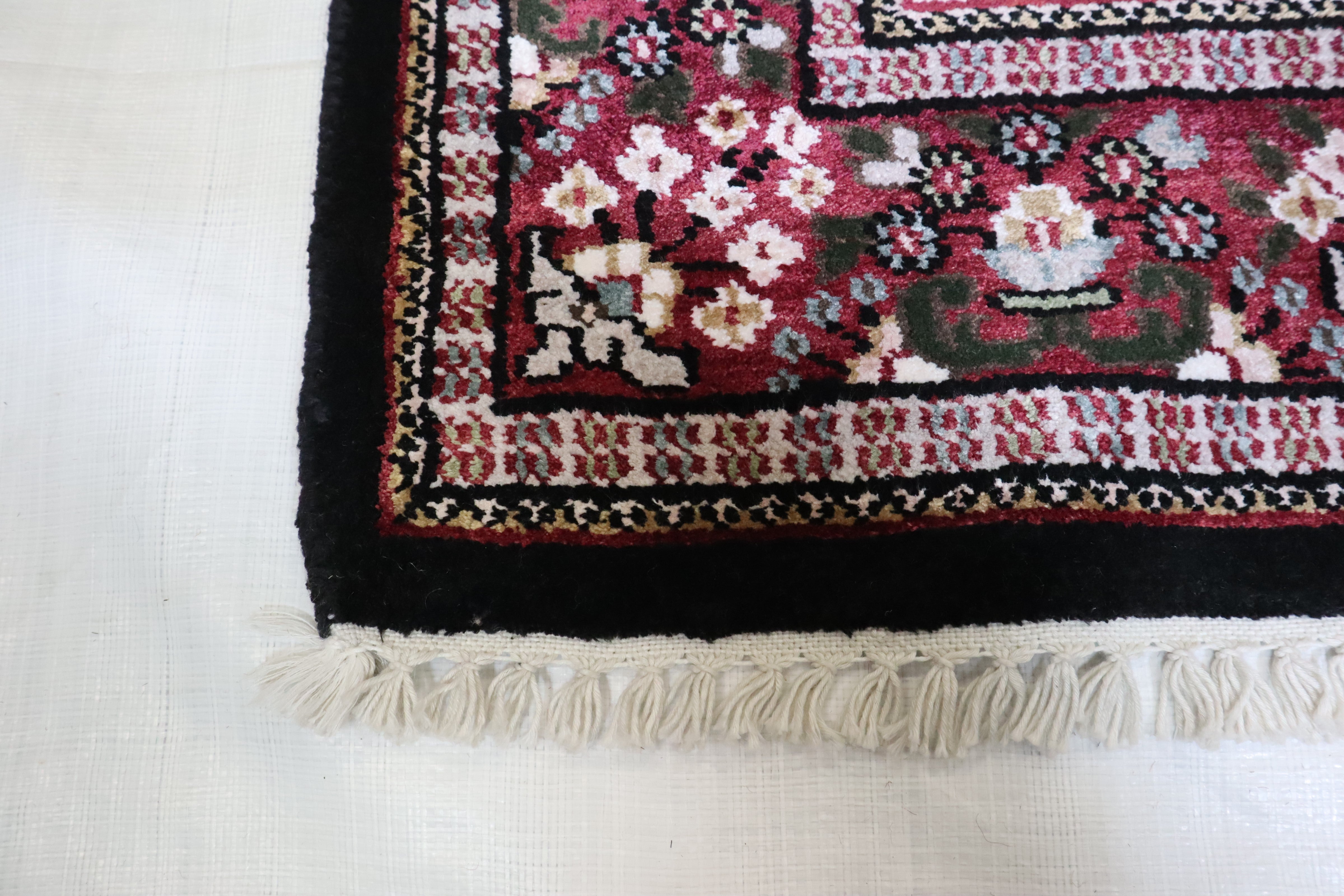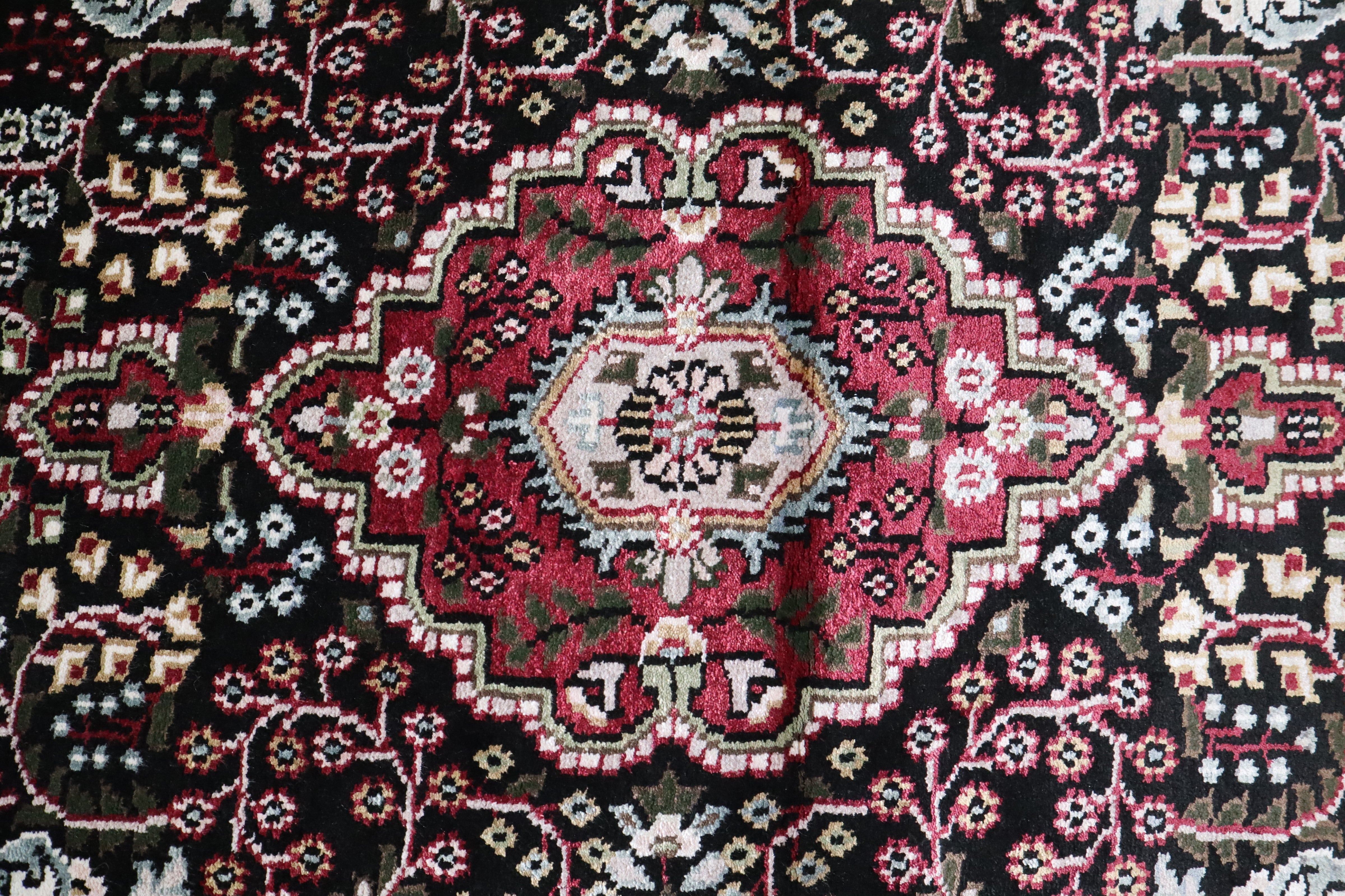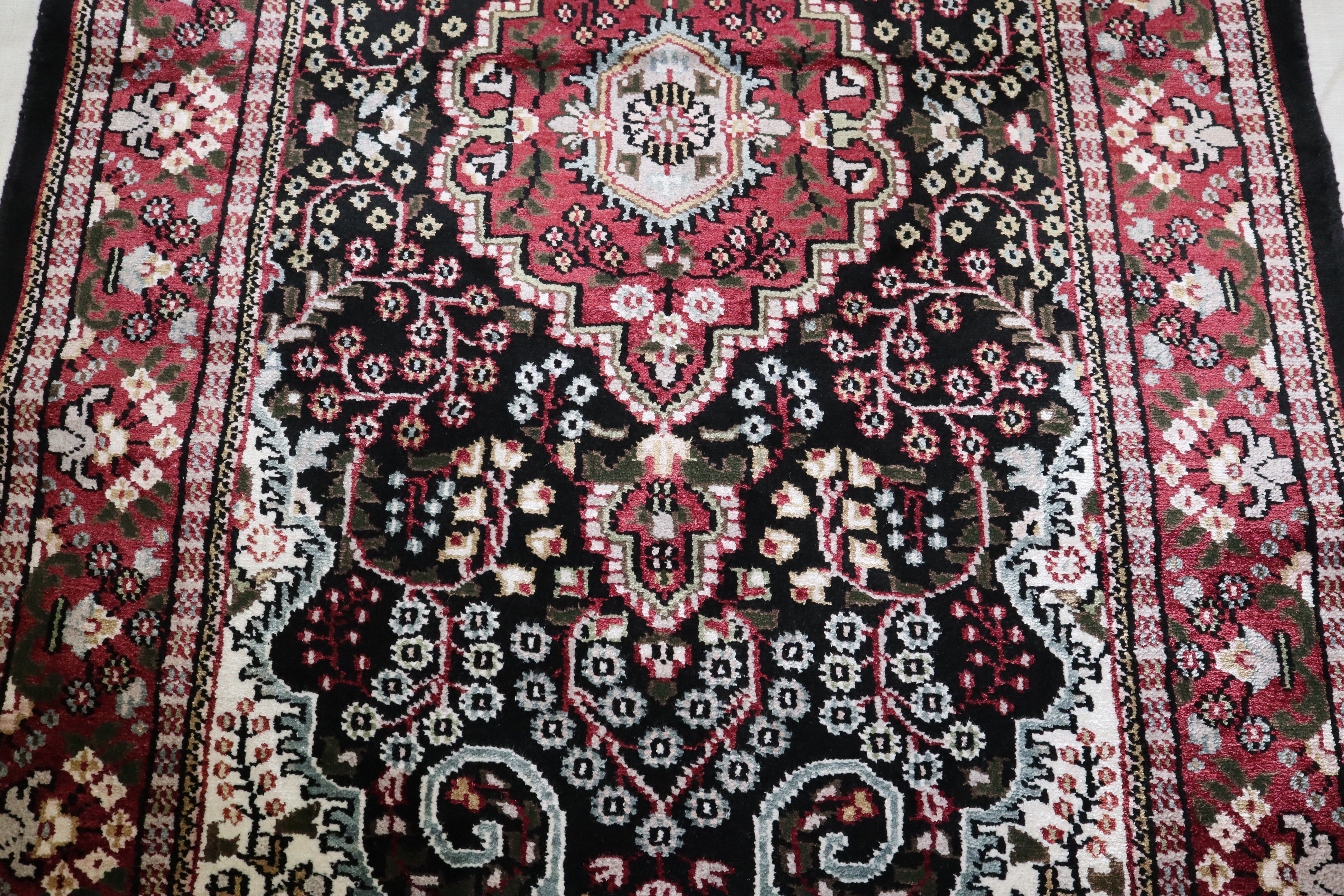 This beautiful hand-knotted rug is made with 100% wool and silk.
