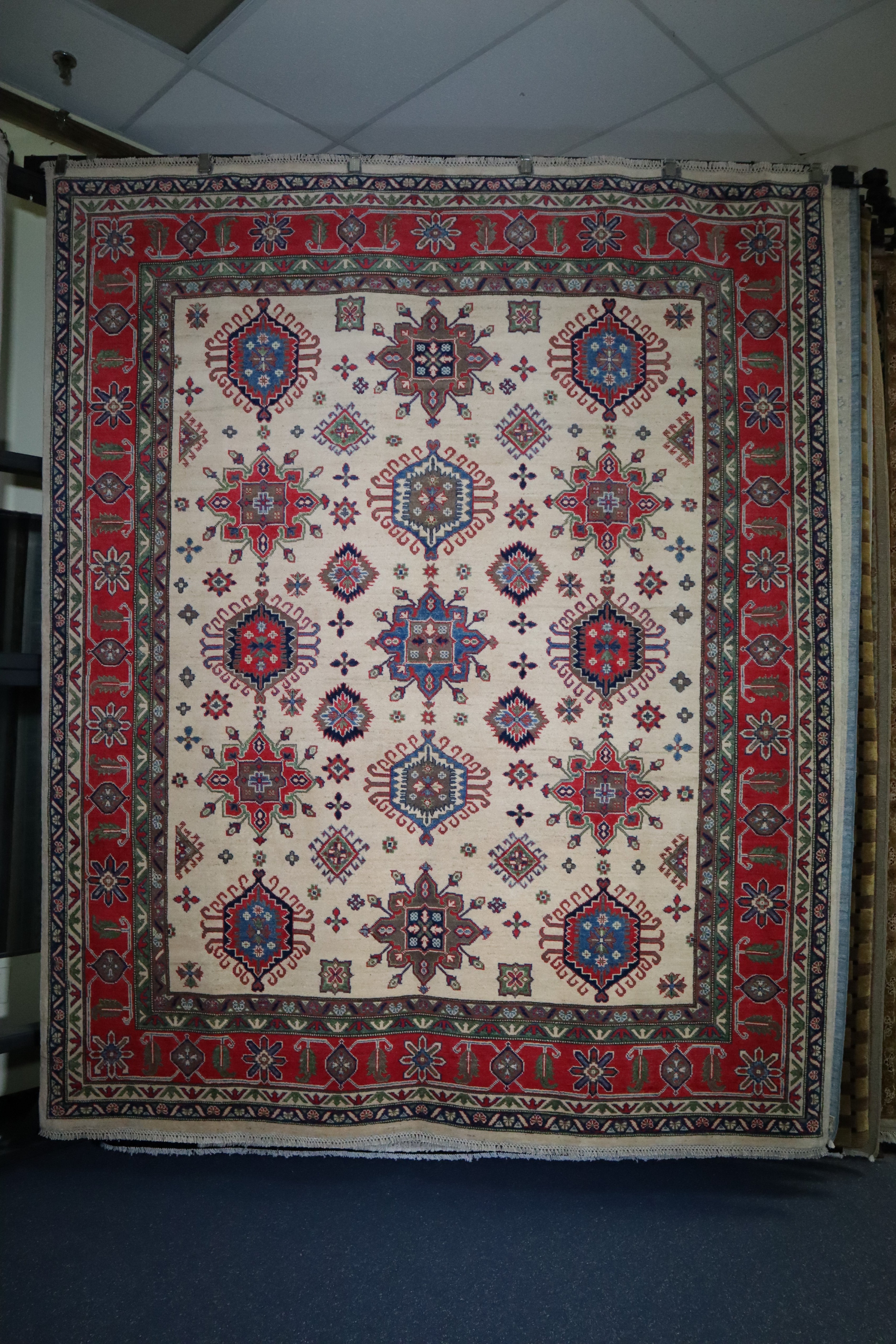 This beautiful hand-knotted rug is made with 100% wool.