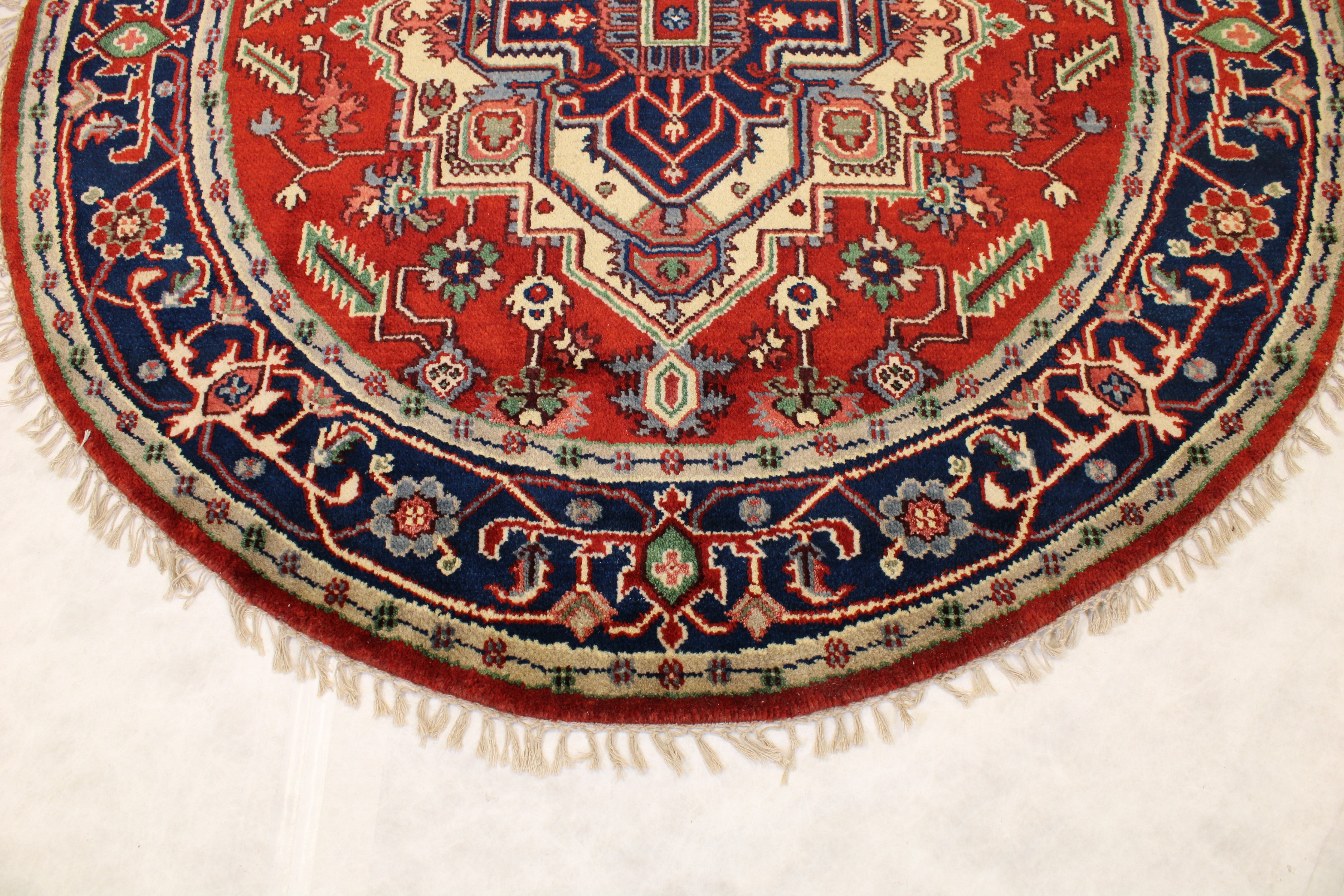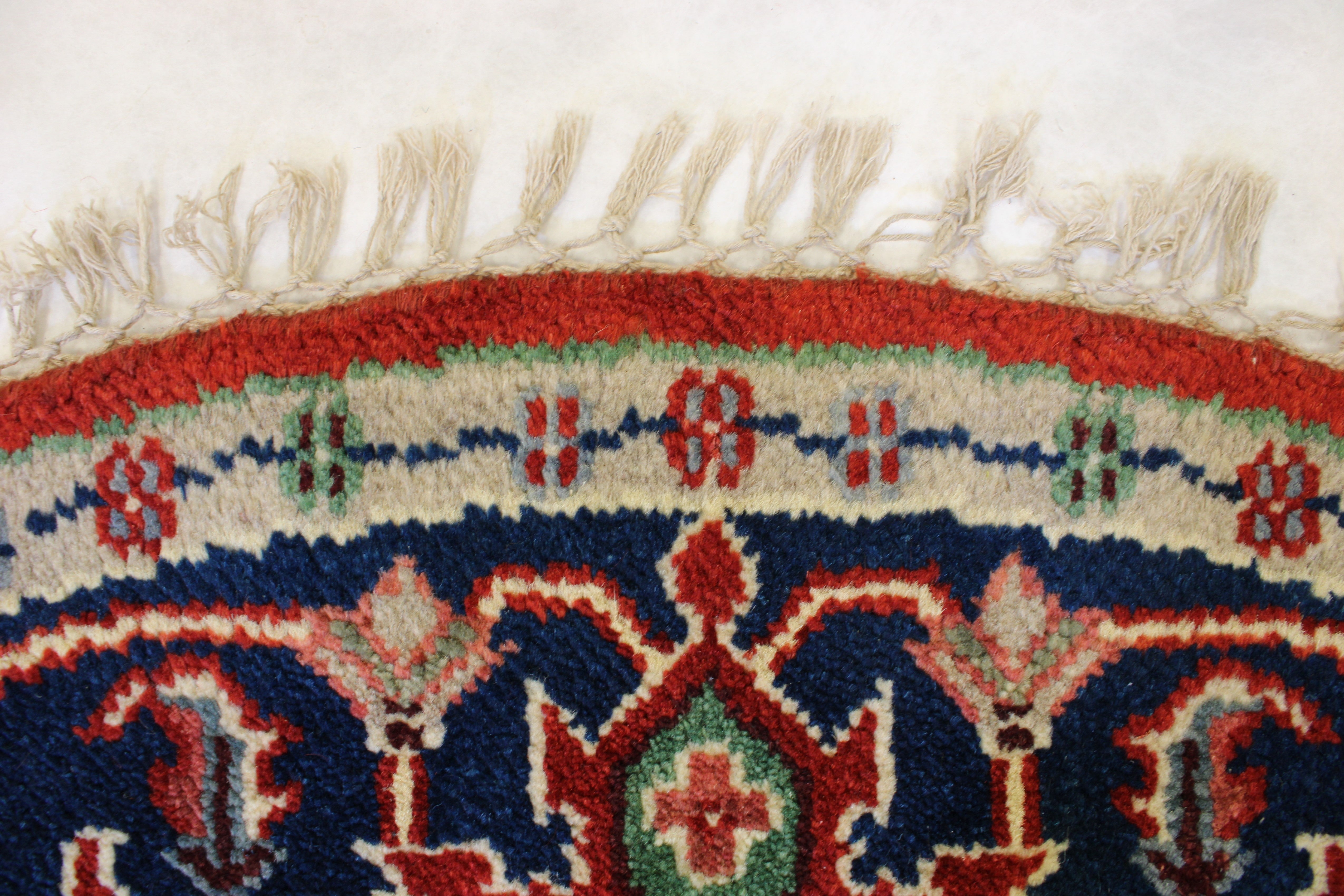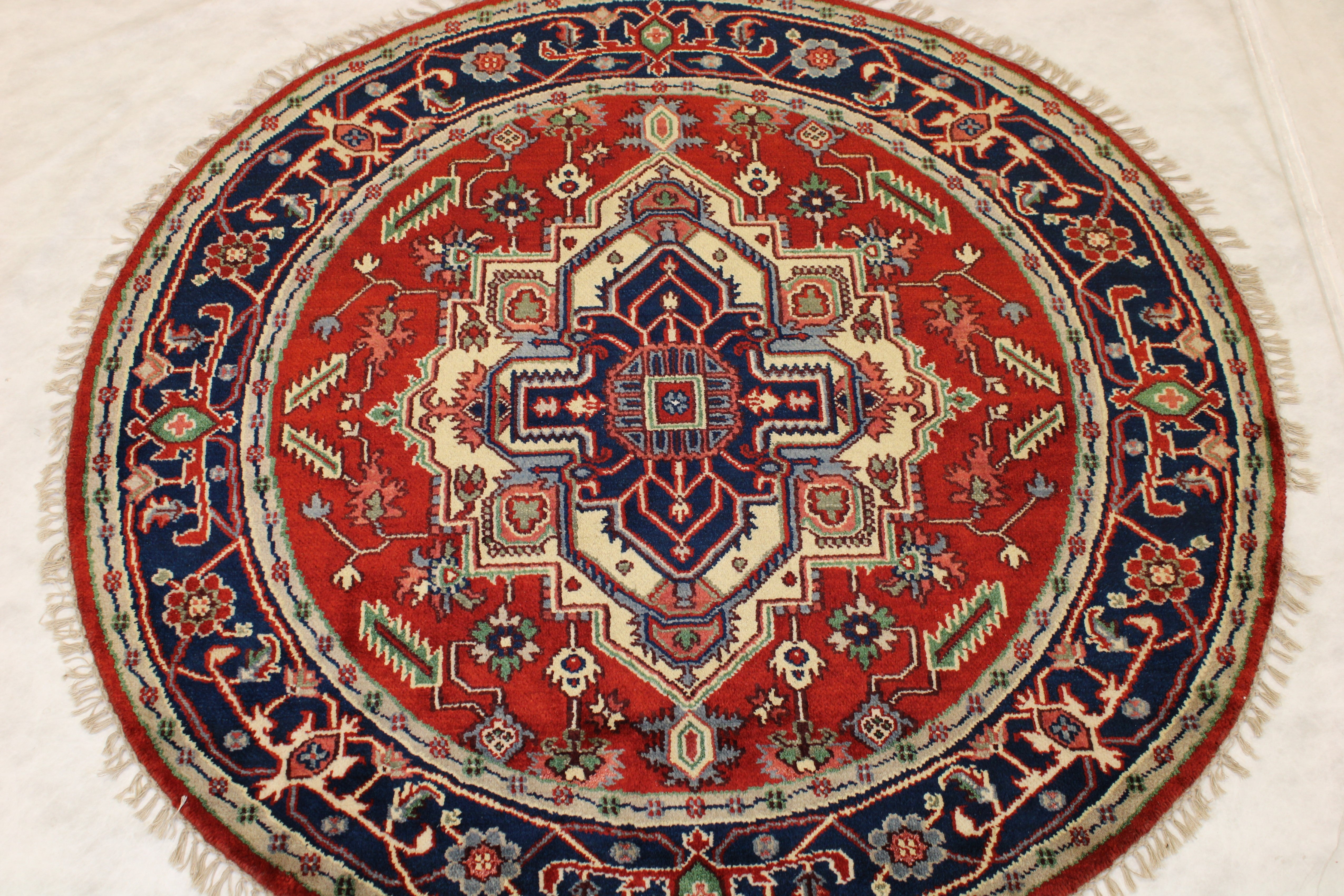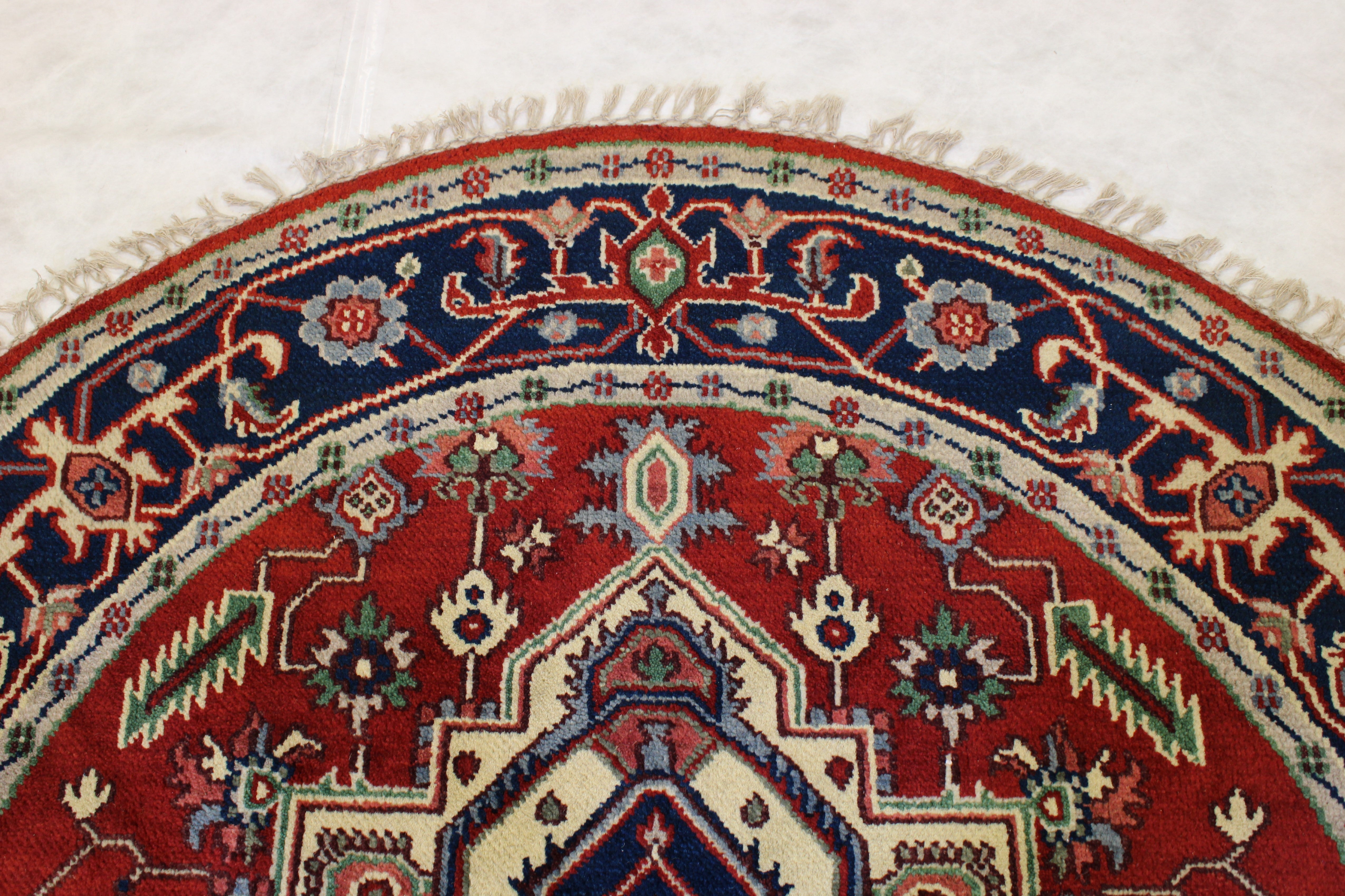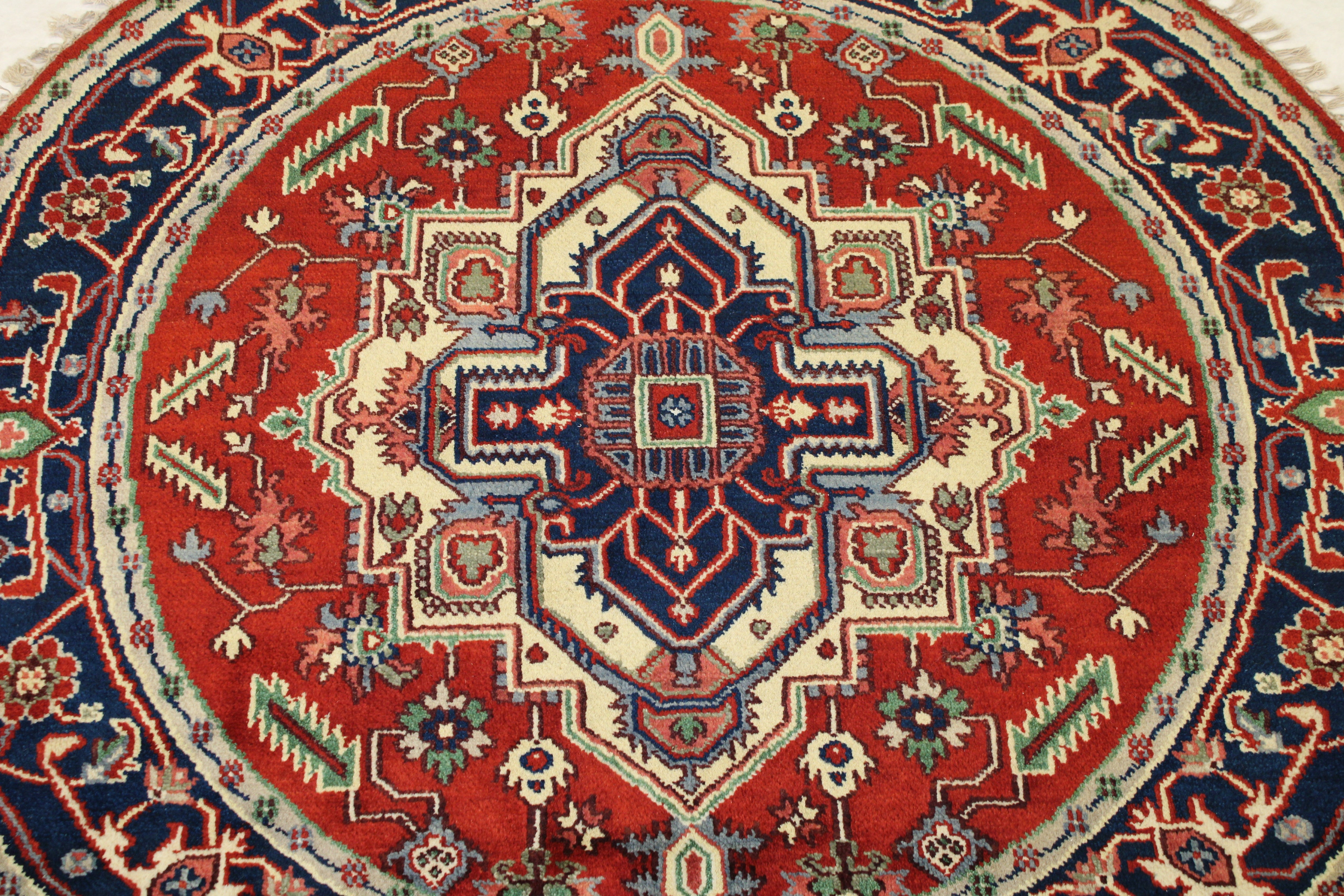 This beautiful hand-knotted round rug is made with natural wool.