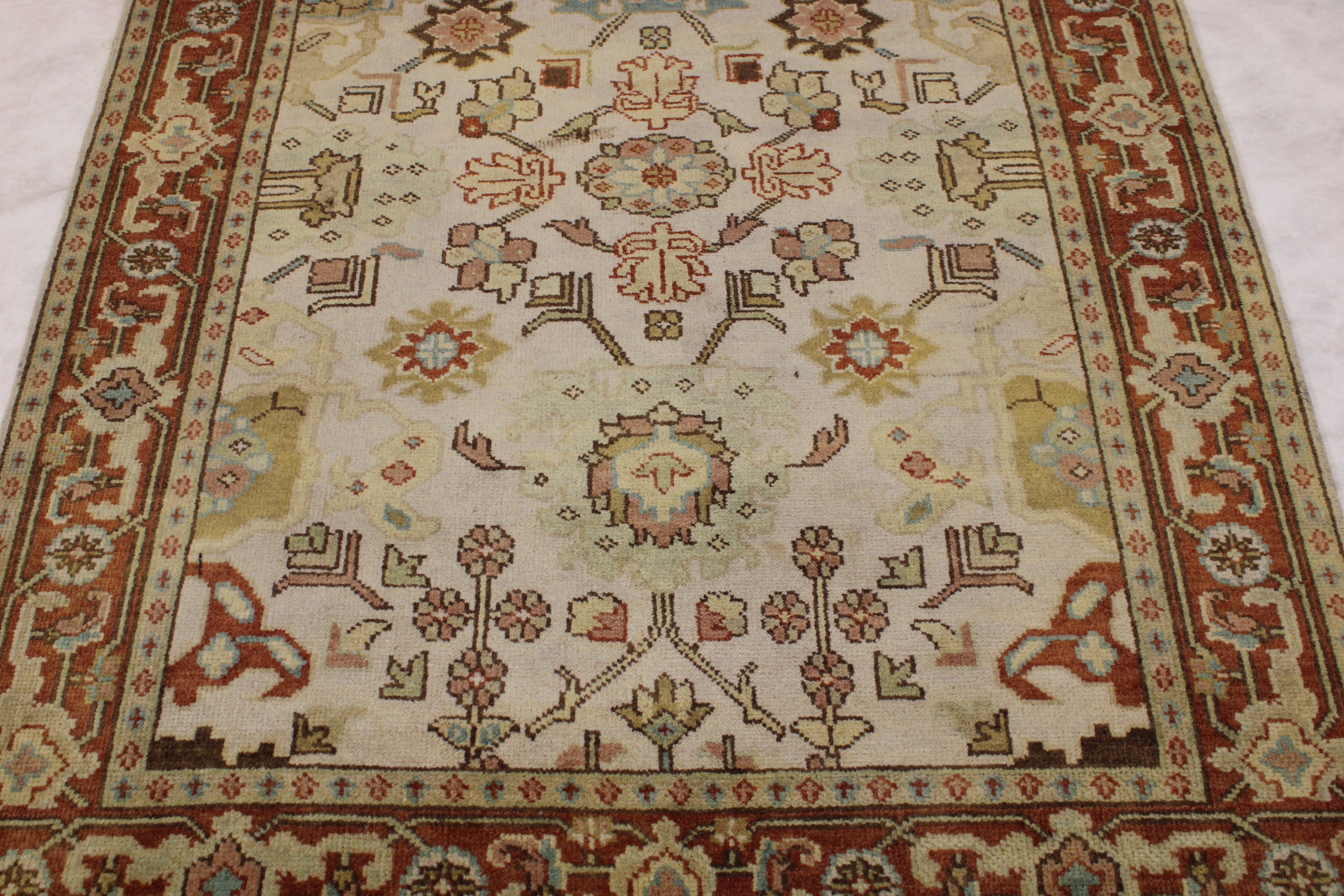 This beautiful hand-knotted rug is made with wool.